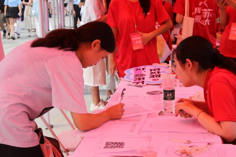 今年报到点设置了创意手牌,新生们在创意手牌前拍摄了大学第一张照片,留下美好回忆。学院提供的特色文创产品蕴含着文以载道的寓意。“飞花令”诗词接龙游戏让同学们感受到了学院浓厚的人文氛围。