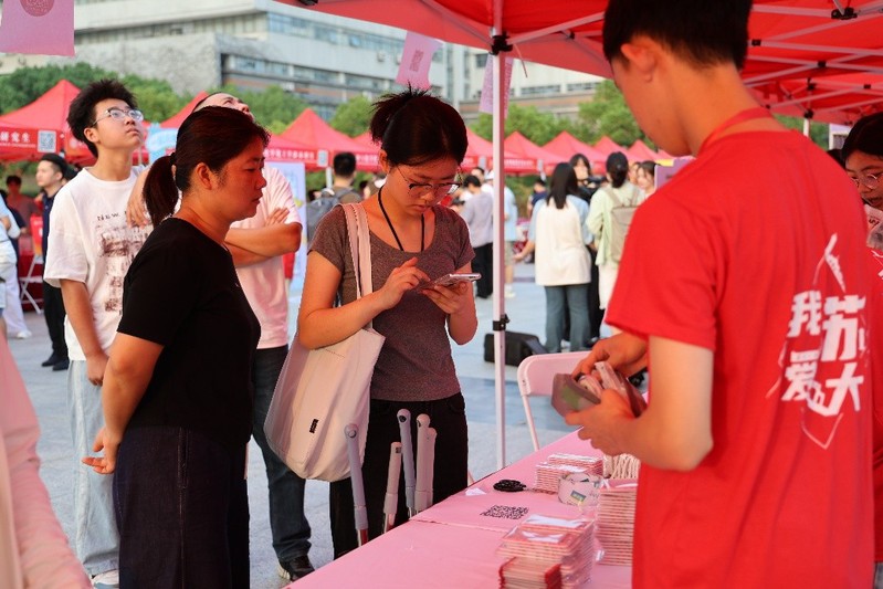 曹炜院长早早来到迎新现场,详细了解报到情况,看望在酷暑中工作的师生、志愿者们,并对整体组织工作予以肯定。曹炜院长特别关注到,汉语言文学(拔尖创新班)的张忆文是一名“苏二代”,在与张忆文及其家长的交流中,学生家长表示:“送孩子来当年读书的地方,既亲切又激动。希望她在这里学有所成,走出属于自己的精彩之路”。