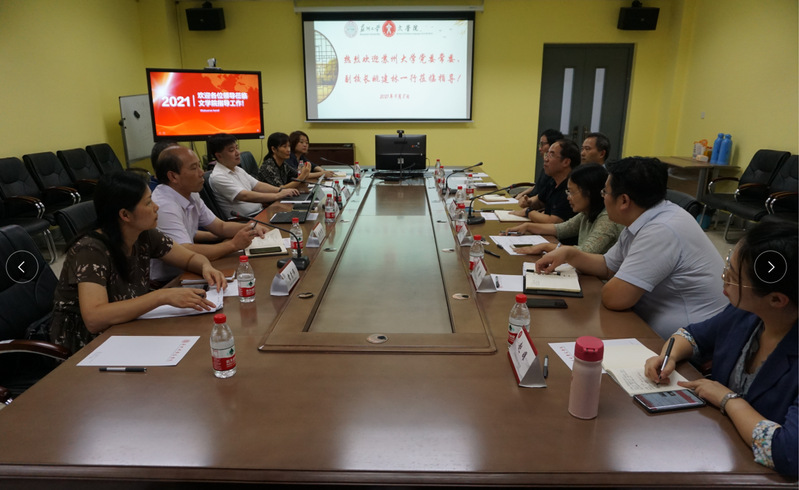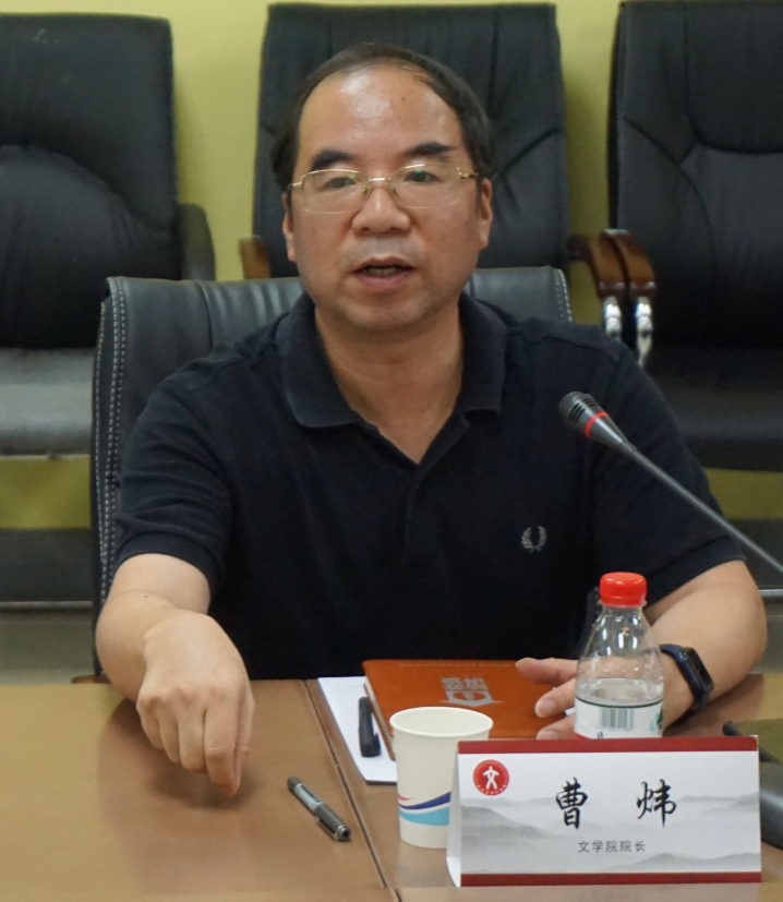 曹炜院长首先汇报。他说文学院现有79名专任教师,一个一级学科博士点,一个一级学科硕士点,两个省重点学科,四个专业。学院接下来的近期工作任务是迎接师范认证专家进校工作。远期工作是引进人才,加强师资队伍建设,抓学风建设,提高学生质量等。