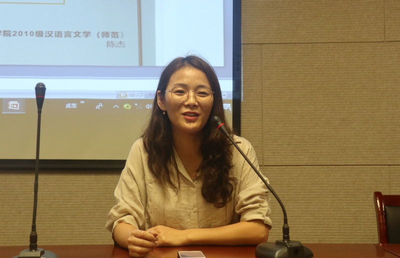 首先进行分享的是陈杰同学,她现就职于苏州工业园区文萃小学。她从“不忘初心、牢记使命”切入,讲述了她的初心。随后,她生动地向大家讲述了她“不学霸非学渣”的学习日常。让她感到遗憾的是自己将考试看得太重要,而忽略了答案背后更丰富的内涵。她感谢自己在学生组织的经历,这期间所认识的各种人,使她逐渐学会如何与人们相处,也让她慢慢形成了自己的应对之道,这样的能力对师范生的帮助是非常大的。另外,她认为经验是个很有魔力的东西,能给予人自信心。“一个学生气的老师”,这是她的师傅对她的评价,但陈杰同学认为“学生气”并不是个贬义词,而是一种情怀,是始终饱有一种思考、一种纯真的态度。她在刚踏入工作岗位时,经历了一段漫长的适应期,因而建议同学们一定要尽快接受自己老师的身份,向家长敞开心扉。在实际工作中,她慢慢感觉到班主任的身份于她更重要,她鼓励同学们趁着有时间和精力,要更多地去关注一下与孩子有关的事。