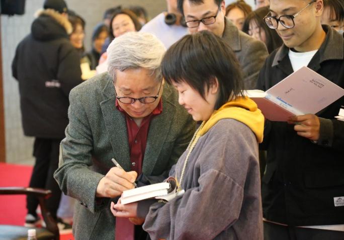 在互动环节,同学们踊跃提问,两位主讲人做出了真诚而又观点独到的回答。讲座后,同学们意犹未尽,纷纷与阎连科先生、程永新先生交流问题,合影留念。