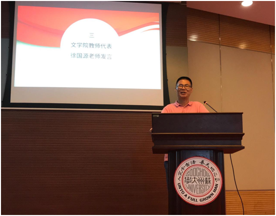 随后文学院教师代表、博士生导师徐国源老师对新加入文院大家庭的同学们表示欢迎,并针对学习方法和思维模式给新入学的研究生们提出了两点建议:尽快适应研究性学习方法、努力培养创造性思维模式。徐国源老师希望大家在苏大度过愉快而充实的研究生生涯,并向大家发出祝愿。
