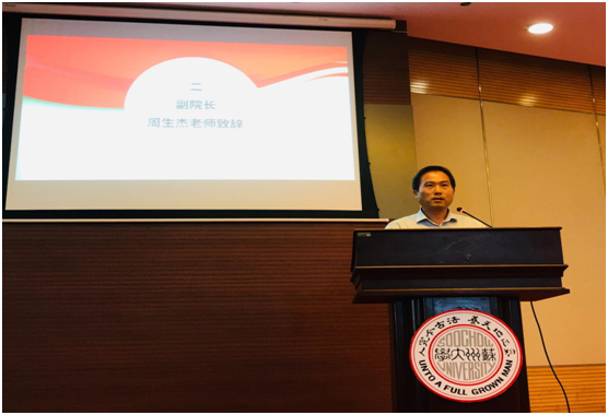 文学院副院长周生杰老师为典礼致辞。周生杰老师对新生的到来表示热烈欢迎,并对新同学的学术生涯和人生规划寄予厚望:“要贯彻苏大‘养天地正气,法古今完人’的校训,希望大家做一个心存浩然正气的读书人!”