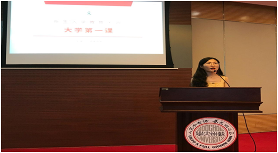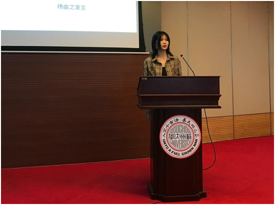 最后,2019级杨由之同学作为新生代表上台发言。她对能够与来自天南海北的大家在苏大相遇表示荣幸,并倡议在座的同学和她一起调整学习方法、遵守学术规范、做知行合一、学无止境的学术科研人员。