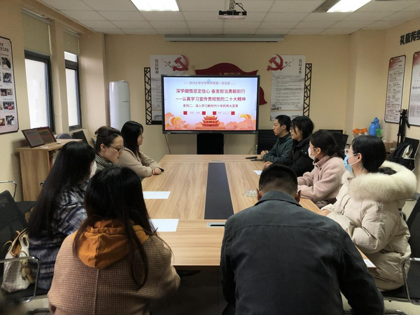 为进一步学习宣传贯彻党的二十大精神,切实把党员的思想统一到党的二十大精神上来,提升党员党性修养,夯实理想信念,筑牢初心使命,助力学院高质量发展,2023年3月17日下午,苏州大学文学院研究生学硕第一党支部于5335会议室举办认真学习宣传贯彻党的二十大精神之深入学习新时代十年的伟大变革的理论学习活动。此次理论学习由党支部书记孙薇同志主持领学,支部全体党员共同参与。