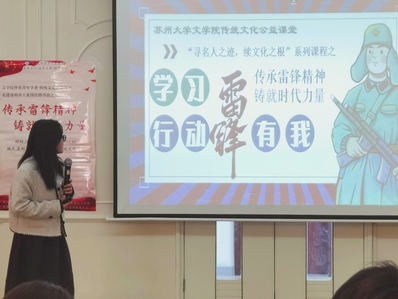 4月9日10:00,由苏州大学中国传统文化工作坊、苏州大学传统文化育人工作室、文学院团委、文学院青年志愿者协会及苏州工业园区图书馆联合主办,文学院青年志愿者协会承办的传统文化公益课堂“传承雷锋精神,铸就时代力量”于苏州工业园区图书馆顺利进行。