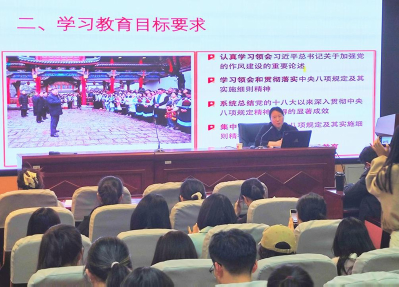 2025年4月15日,文学院分党校在文综楼5339会议室开展2025年第一期预备党员培训班党课,文学院党委书记宋清华作《砥砺作风 求真务实——深入贯彻中央八项规定精神学习教育》专题党课。文学院分党校2025年春季第一期预备党员培训班全体学员、入党积极分子、申请入党人员参加了学习。按照开展深入贯彻中央八项规定精神学习教育实施方案的要求,学院基层党支部书记、党务工作者、年轻干部、关键岗位干部等突出重点群体也参加了此次活动。