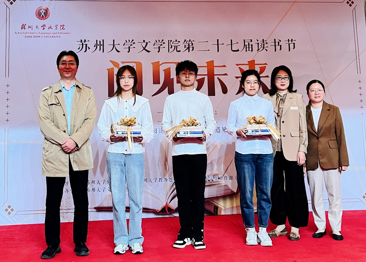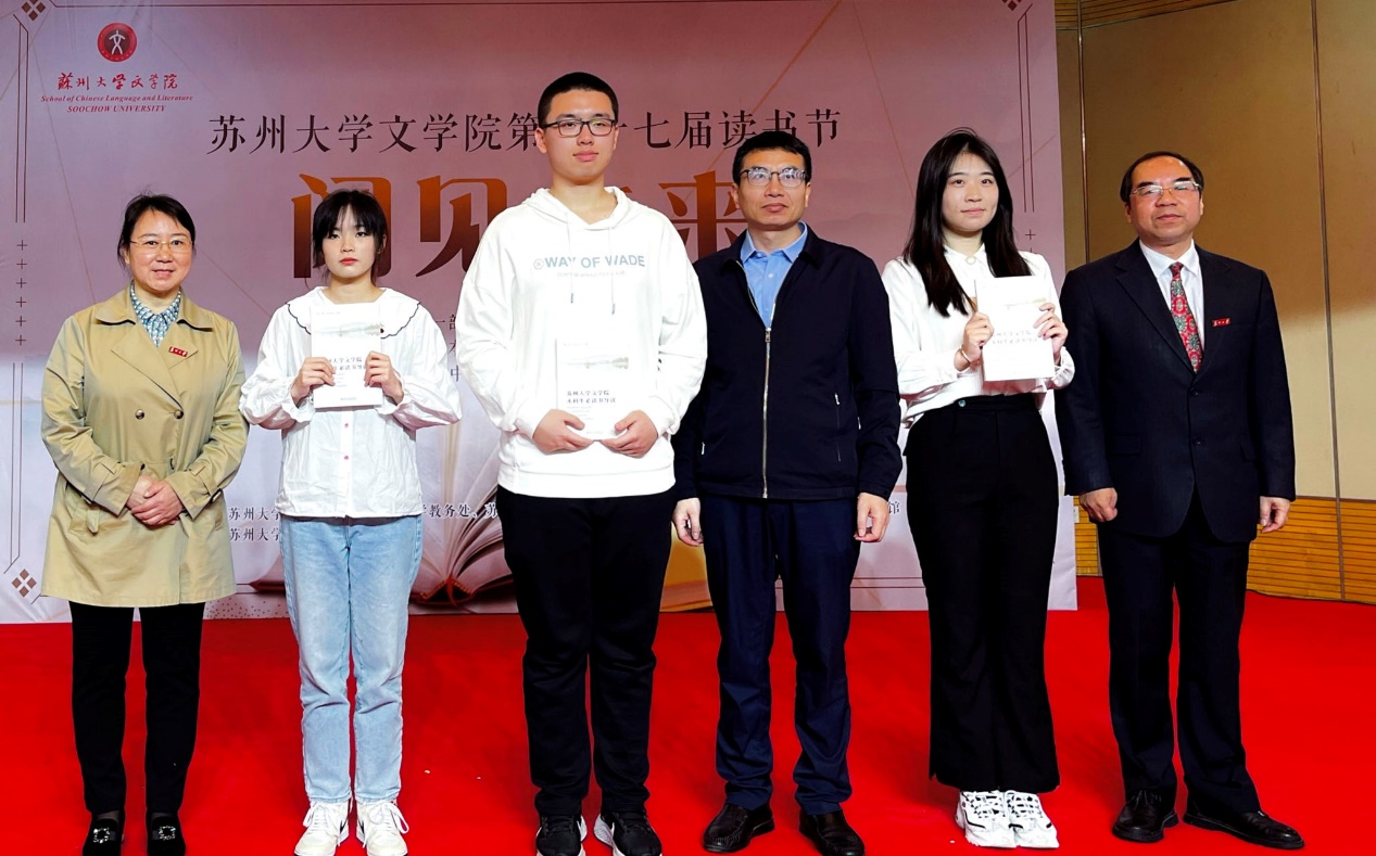 为鼓励同学们与好书为伴,文学院向全校同学推荐文学与艺术类书目共40本,兼顾中国和西方经典著作,涵盖诗歌、散文、小说、戏剧等多种体裁。校党委学生工作部(处)长董召勤宣读了苏州大学大学生经典阅读推荐书单(文学艺术类),并与丁瑶、刘娟共同向学生代表赠书。