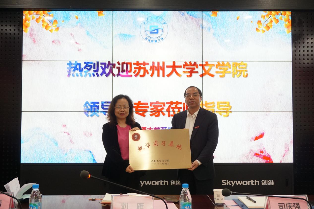 曹炜院长代表苏州大学文学院为西安交通大学苏州附属中学颁发“教学实习基地”牌子,并向司庆强副校长颁发导师证书。周生杰副院长代表文学院向西安交通大学苏州附属中学赠送了汉语言文学类书籍。