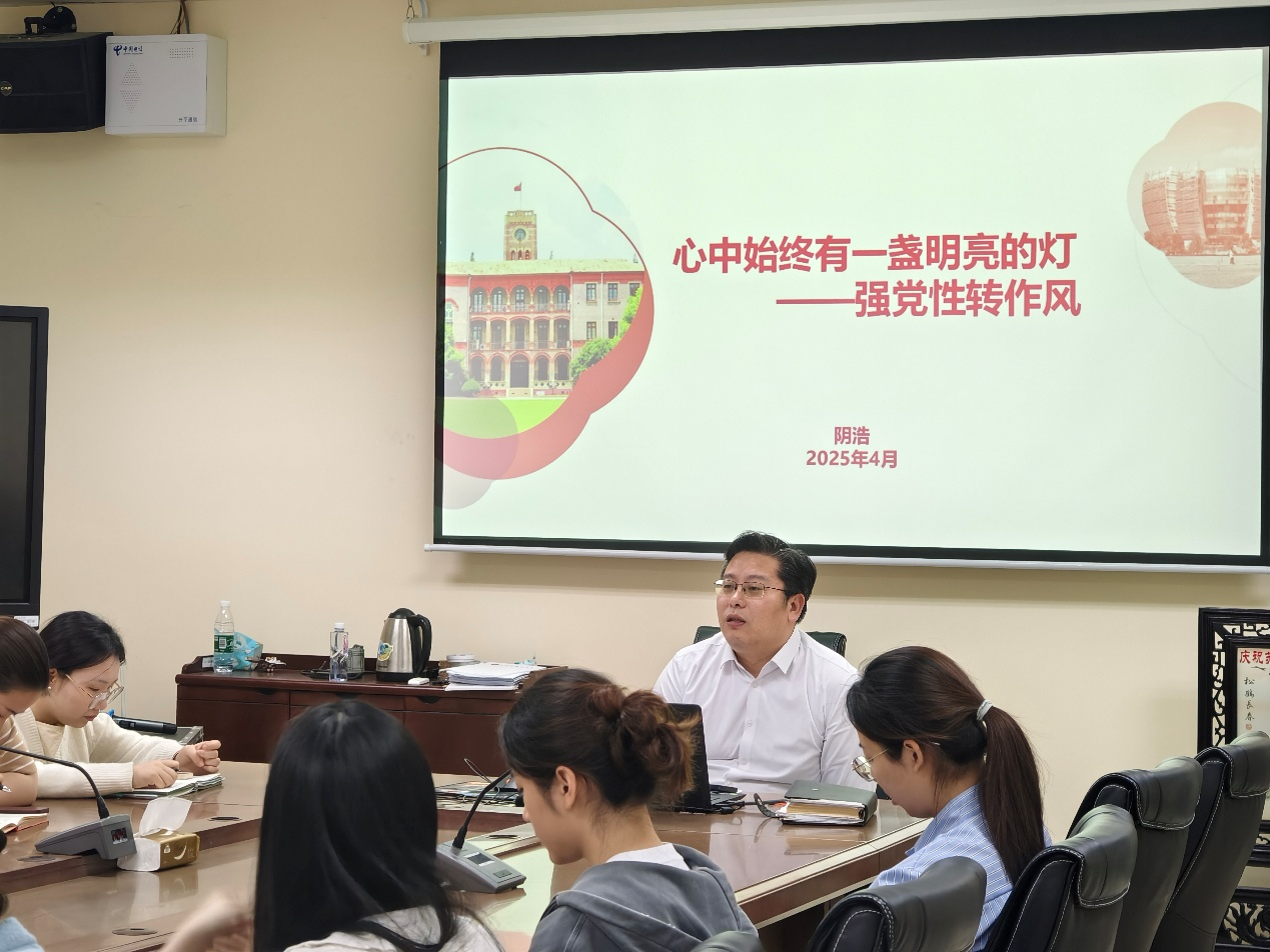 2025年4月24日,为持续深化全面从严治党要求,加强支部党员党性修养,文学院本科学生党支部开展“深入贯彻中央八项规定精神”专题党课。党委副书记阴浩以《心中始终有一盏明灯——强党性转作风》为题作党课讲解,全体本科学生支部党员参加学习。