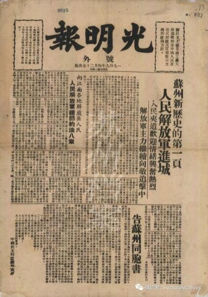 (苏州解放当日民盟苏州地下组织印刷出版《光明报·号外》,