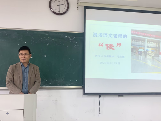 2023年4月24日下午,西安交通大学苏州附属中学副校长(全面负责普惠路校区工作)、高级教师、园区语文学科带头人司庆强老师在苏州大学文综楼4204室做了一场精彩的“漫谈语文老师的俊”讲座。