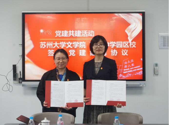 接着,宋清华书记和胡慧敏书记现场签署《中国共产党苏州大学文学院委员会与中国共产党江苏省苏州中学园区校总支部委员会党建结对协议书》,宋书记感谢苏州中学园区校的精心安排,对学校党建工作做简单介绍,希望未来通过党建结对,强强联合,共建共赢。
