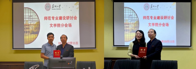 研讨会第一个议程,由曹炜院长为文学院新聘的师范专业校外导师颁发聘书,感谢他们一直以来对于文学院师范专业建设的指导与支持。