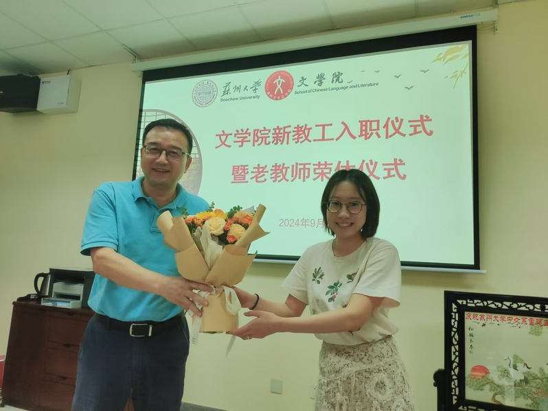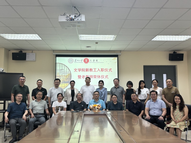 最后曹炜院长从“光荣”、“生态”、“未来”三个方面做总结发言。他说,今天学院举办新教工入职暨退休教师荣休仪式,是学院尊师重教薪火相传的光荣传统,欢迎新教工,祝福老教师退休生活快乐幸福,健康长寿!他盛赞以钱锡生教授为代表的退休教师们是学院的宝贵财富,他们人品高尚,学问扎实,是学院全体教工学习的榜样,更是年轻教师们的标杆,是为人为学为师的典范。曹院长表示,苏大文学院有着光荣的历史,辉煌的成就,离不开学界大佬、教学名师为我们奠定的坚实的基础,近些年来,全院上下心往一处想,劲往一处使,整个生态氛围欣欣向荣;对于未来,唯有奋斗,每一位老师的辛苦付出成就了今天的文学院,文学院取得的成绩属于全体师生。一代一代的文院人,承前启后,荣辱与共,共同谱写文院华章!最后,在教师节、中秋节、国庆节即将到来之际,曹院长祝老师们节日快乐,万事如意!