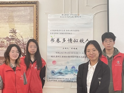 5月7日10:00,由苏州大学中国传统文化工作坊、苏州大学传统文化育人工作室、文学院团委、文学院青年志愿者协会及苏州工业园区图书馆联合主办,文学院青年志愿者协会承办的传统文化公益课堂“书卷多情似故人”于苏州工业园区图书馆顺利进行。