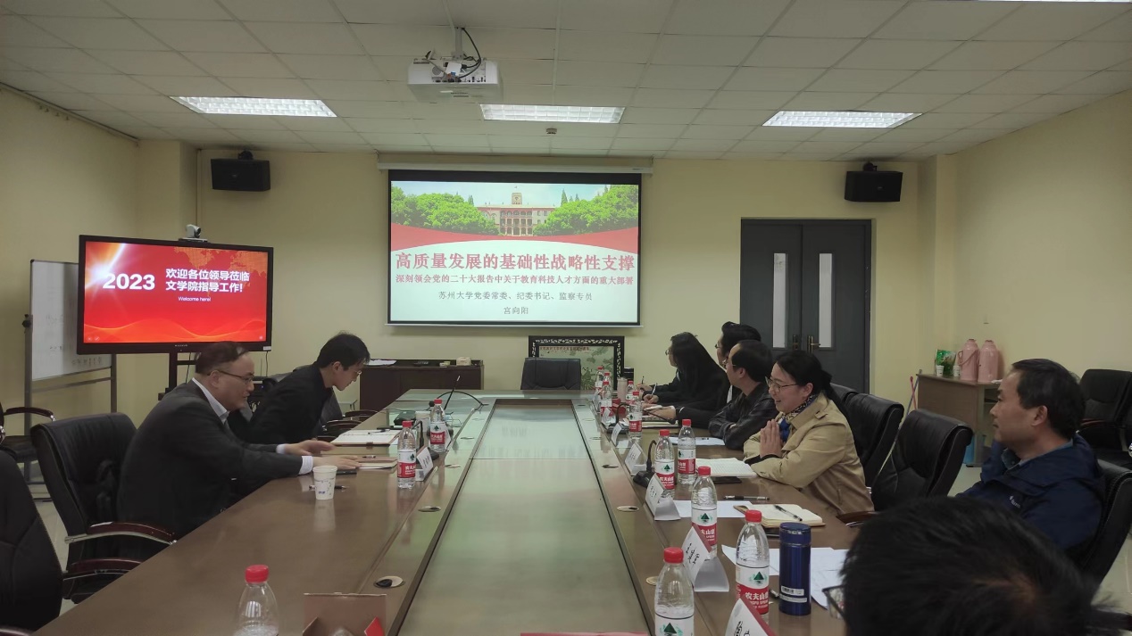 调研会后,宫向阳书记以《高质量发展的基础性战略性支撑——深刻领会党的二十大报告中关于教育科技人才方面的重大部署》为题,为学院主题教育读书班作专题辅导报告。他从准确把握党的二十大的重要意义和大会主题、深刻领会中国式现代化全面推进中华民族伟大复兴的使命任务和教育科技人才方面的重大部署以及苏州大学的使命和担当等四个方面,深入阐述了新时代新征程教育科技人才的重要性,提出我们应胸怀“两个大局”,心系“国之大者”,奋力谱写“双一流”建设苏大新篇章,为全面建设社会主义现代化国家、全面推进中华民族伟大复兴作出新的更大贡献。