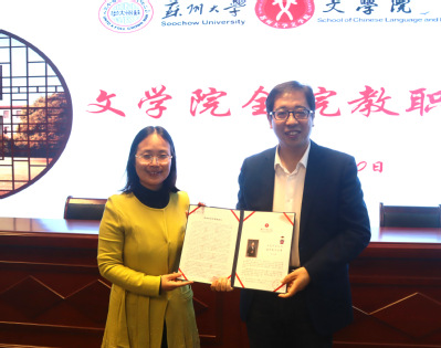 文学院党委书记孙宁华为王立增教授颁发了东吴语文教育讲坛的聘书并合照。