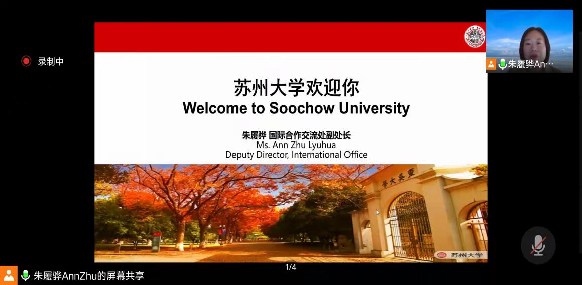 2021年10月19日晚,苏州大学与尼日利亚拉各斯大学中国学专业2021级新生开班欢迎仪式在线上顺利举行,国际合作交流处副处长朱履骅、文学院院长曹炜、海外教育中心主任陶家骏、专业教师代表周品、三位学生代表及2021级新生出席会议。会议由留学生辅导员薛羽婷老师主持。