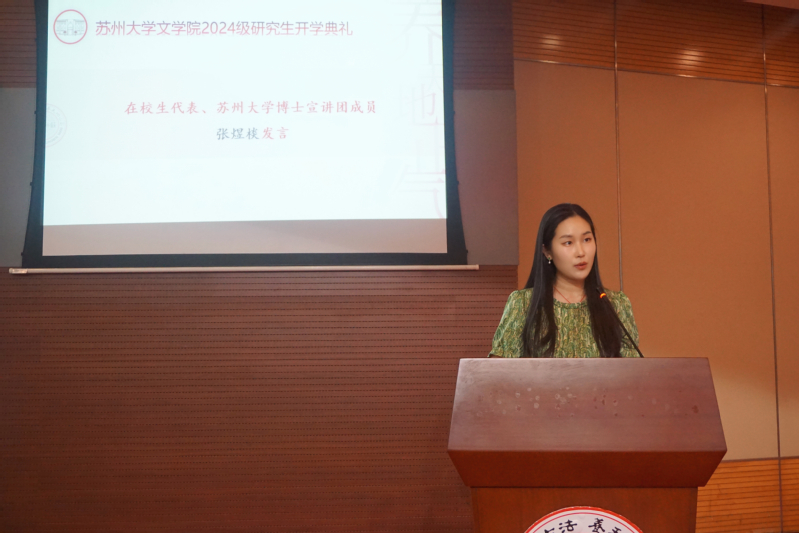 来自2022级博士班的张煜棪以“乒乓球赛喻读研之路”为主题,向同学们分享了自己在苏大的感受。她首先以近期备受关注的奥运会乒乓球比赛为例,巧妙地将读研之路比作一场乒乓球赛。她指出,读研就像打乒乓球一样,不论过去成绩如何,每一次挥拍都是新的挑战,都需要全力以赴。她鼓励新生们要专注于眼前的学习任务,一板一板地打,一球一球地接,一分一分地拿,不断积累,不断进步。除此之外,她还表达了对苏州这座城市的热爱和赞美,鼓励新生们要珍惜在苏州大学的学习时光,积极融入这座城市的文化与生活中,感受它的独特魅力和深厚底蕴。