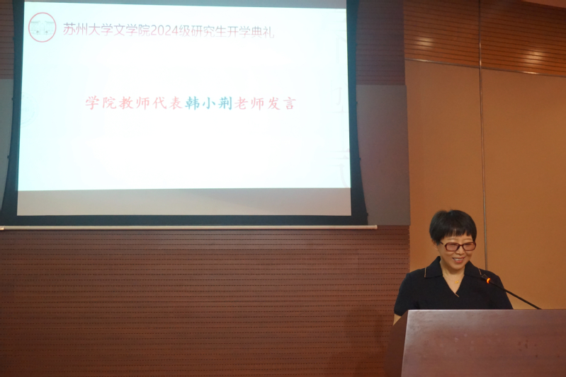 随后,学院党委书记宋清华致欢迎辞。宋清华首先祝贺2024级研究生新生升学成功,随后介绍了苏州、苏大及文学院的发展历史和成就。她强调,苏州作为一座底蕴深厚的文明古城,兼具传统与现代之美,为学子们提供了广阔的学术与文化探索空间,“养天地正气,法古今完人”的校训,激励了一代又一代苏大人奋发前行,苏大也取得了长足的进步;文学院更是历史悠久,师资雄厚,为新生们的学术成长和职业发展提供了坚实的基础。最后,宋清华勉励新生们要珍惜时光,努力学习,做最好的自己,今日我以苏大为荣,他日苏大一定以我为荣!