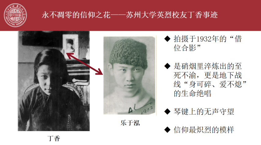 在本次党日活动中,同学们分成两组分别讲述了苏州大学英烈校友丁香与臧庚的英烈事迹。