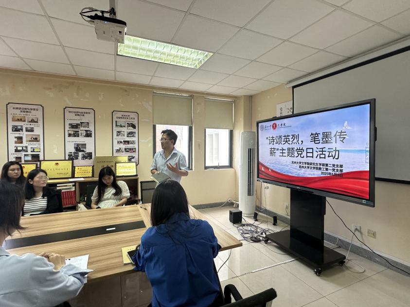 为纪念中国人民抗日战争暨世界反法西斯战争胜利80周年,从践行新时代爱国主义战略高度出发,推动党史学习教育,将红色资源转化为铸魂育人的强大效能,2025年6月5日下午1时30分,苏州大学文学院研究生学硕第二党支部与教工第一党支部在文综楼5311室组织了“诗颂英烈,笔墨传薪”主题党日活动。