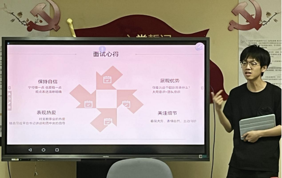 三位党员学长学姐讲解结束后,是学生提问和个性化解答环节。针对大家普遍存疑的问题,三位学长学姐面向全体,结合自己的经验依次解答。如大家关注的师范生基本功大赛问题,同学们大多对其中的流程不太明晰,同时面对网上众多的建议不知从何入手。学长学姐们表示,首先要重视师范专业课的学习与师范技能的培养,打牢知识基础;同时,表现从容大方、气场、讲台的状态及互动,粉笔字要注意端庄。在解答过程中,同学们频频点头,纷纷表示收获满满。