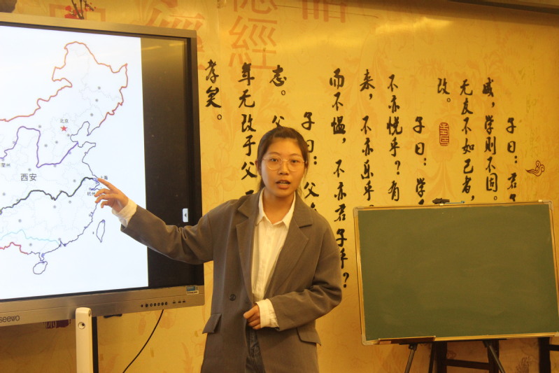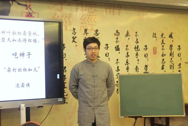 随后,刘承智同学就霜降习俗给小朋友们进行了趣味横生的介绍。他提到了典型的霜降美食——柿子与螃蟹。说到柿子时,刘承智同学还将朱元璋与柿子的历史典故娓娓道来。对于刘同学的提问,在场的小朋友们都踊跃举手发言,课堂氛围十分融洽。刘承智同学带领孩子们重点学习了《舟中杂纪》,由反复的朗读入手,继而分析句意、阐释典故,层层递进,直至再次通读全诗。最后,伴着悠扬古老的钟声,刘承智同学以优美的对联完美结束了这次以霜降为主题的公益课堂。