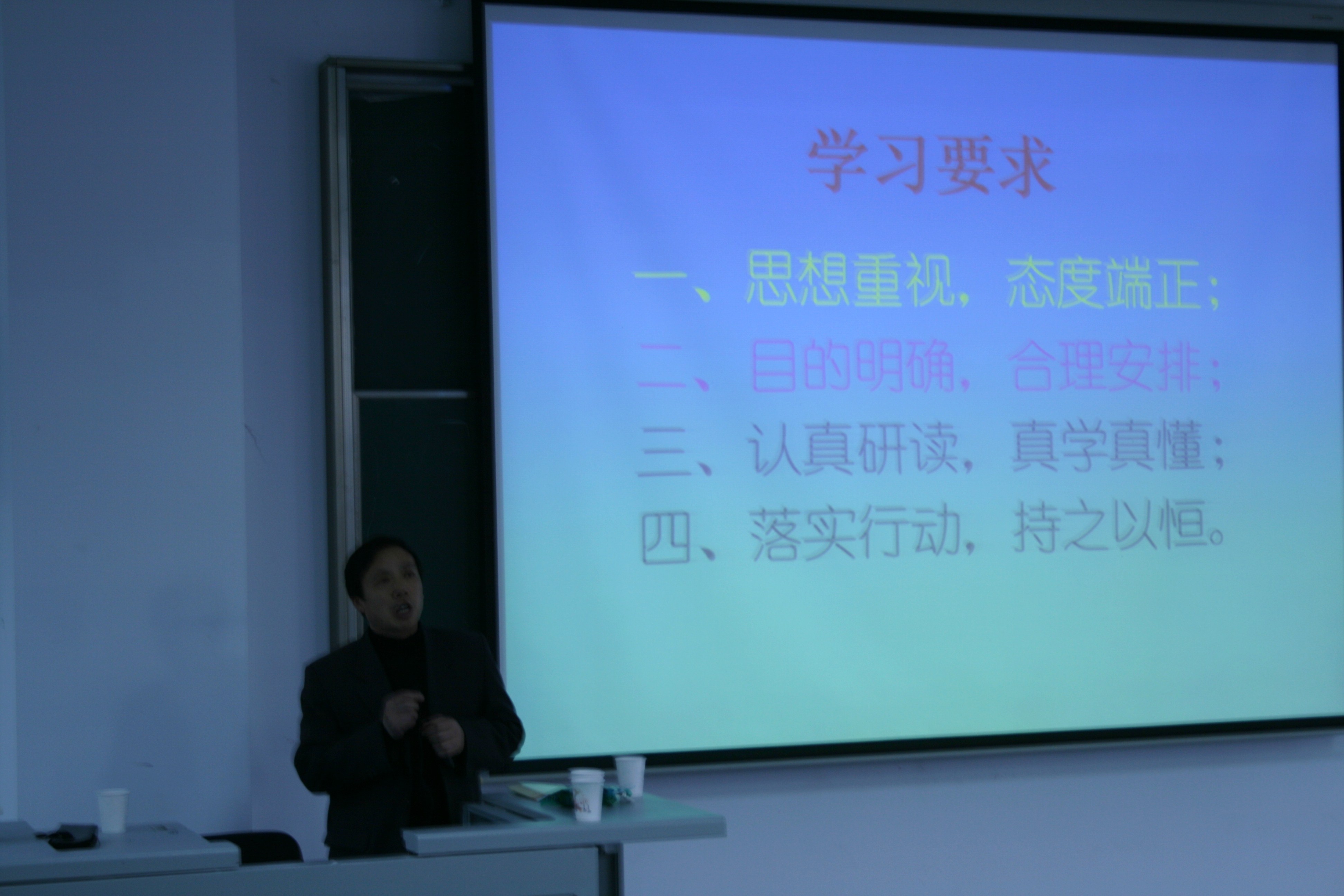 开学典礼由文学院党委书记王六一同志主持。苏州大学党委宣传部部长芮国强同志为全体学员做了《深入学习党的十七大精神》的辅导报告。报告由三个部分组成:十七大的意义,十七大的主要精神,十七大在理论上的贡献等。整个报告深入浅出,特别是对科学发展观的分析,条理清晰,见解深刻,令在座的每一位学员受益匪浅。