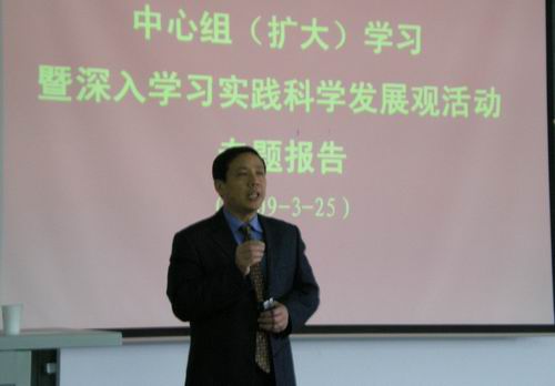 (通讯员:周奕欣 许恬甜)2009年3月25号下午两点,苏州大学文学院中心组(扩大)学习・暨深入学习实践科学发展观活动专题报告在文综楼1001―1101的报告厅举行。苏州大学校党委常委、副校长陈一星作辅导报告。院党政领导与全体教师及全体学生党员参加了学习。