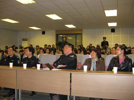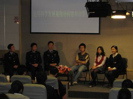 会议首先涉及的话题便是“和谐”,向往和谐由来已久,然剥去其空泛的外壳,它究竟意味着什么?谢心阳提出,强调和谐必因有不和谐之处,追问反面方可有成。他的这一见解得到了大家的一致赞同,若如是,是警察形象的问题给警民关系注入了不和谐的因素吗?主持人就此发问。茆萌主席说,警察都有两套制服,一者正式严肃,是执法工作时必需;一者休闲轻松,代表了警察们在公正执法后也有他们温情的一面。她认为同学们不应被由此职业的特殊性而引发的距离感所牵引。也许是受此启发,台下的同学们似乎也逐渐摆脱了与制服警帽如此近距离同座共话的拘束感,纷纷表达自己对警察形象的看法。从同学们的发言中,不难看出民警带给大家的安全感、信任感以及铁面下的默默鼓励。当然,也有同学陈述了曾遭遇的办案不尽力、态度不友好等情况。对此,谢心阳作出总结,他认为除去艺术形象,警察的现实形象可分三层。其一是艺术形象的延伸,表现为威严无私。其二是承认其作用但因其职业特殊性难有好感。其三则是因部分警察行为不当或群众对警种认知不够以及假警等现象而对警察形象产生负面印象。其中的第二与第三部分都是不和谐因素的来源。这一番精辟的分析也获得了大家的赞同。据此,主持人分析,要对这些问题予以解决必从两方面入手,民警们应该有更高的自我要求而同学们也需更配合他们。确实,当警员们说起自己的家庭,谈到自己的生活时,也同我们一样,是需要理解的普通人。杨�出生在警察家庭,对警察的生活有更深入的了解。她告诉同学们要更多地看到制服下的他们,他们都是很可亲的为我们服务的人。这时便也回归到了话题的中心――科学发展观。科学发展观的核心是以人为本,具体到警民关系上来说应是双向的:民警是人民的警察,执法过程中应宽严相济、重人本;同时,他们本身也应该得到大家的尊重与体谅,如此,方才是和谐的开始。