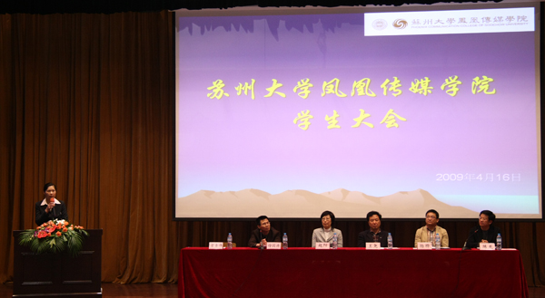 2009年4月16日晚,苏州大学凤凰传媒学院首次学生大会在独墅湖校区文科艺术楼音乐厅举行。凤凰传媒学院院长、文学院院长王尧,学院执行院长杨桦,学院党委书记赵阳,副院长陈龙,副院长徐国源,党委副书记兼任副院长常青伟,及凤凰传媒学院全体本科生及研究生参加大会。