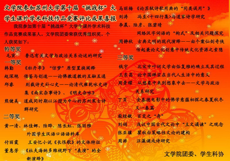 文学院参加苏州大学第十届“挑战杯”大学生课外学术科技作品竞赛评比成果喜报