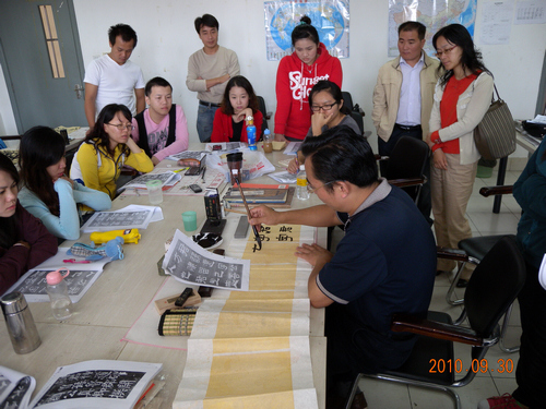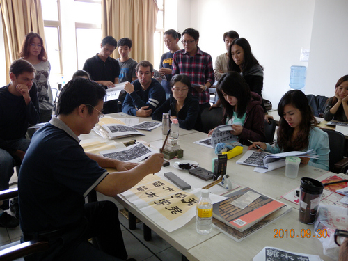 日前,王伟林教授应邀为留学生讲授《中华文化才艺与展示――书法专题》课程,讲授并展示了中国书法的精妙。王伟林先生是苏州市文联副主席、苏州市书法家协会副主席、江苏省书法家协会副主席兼学术委员会主任、中国书法家协会会员、国家一级美术师、苏州大学兼职教授。
