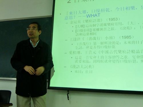 来自香港教育学院中文系的朱庆之教授于11月15日在文综楼为文学院学生开了一堂关于“东汉乐府民歌中的佛教影响”的讲座。到场的领导有文学院副院长逢成华和办公室主任黄晓辉,讲座由逢成华副院长主持。