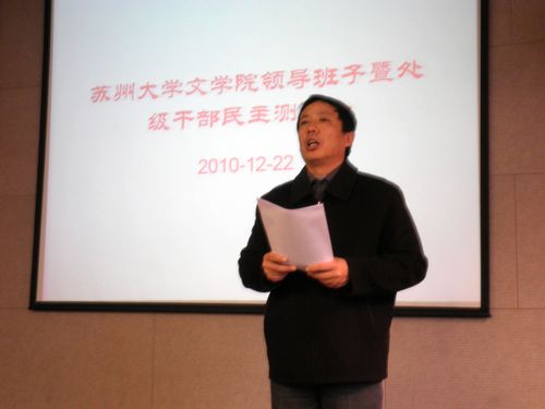 首先,王尧院长对本学期学院情况进行了总结。王院长肯定了所有教职工在创造学院积极向上的文化氛围中的成绩,并提出要关心老年教职工及其他需要关心的教职工。同时王院长也提到了文学院西迁的问题,因考虑到现在的办公用房不足,希望西迁至本部后能为老师和学生提供更好的教学设施。随后,院长还说到本学期举办的几个研讨会,肯定了其效果,并对一些老师的论文给予了很高的评价。可喜的是,在211评估时全校共获得的6个A中,我院古典文学也荣幸地获得其中一个A。另外,王院长也要求今后的各项工作要更加规范化,总体评价是:十一五比十五有进步。最后要求大家注意准备期末考试及放假安全问题。