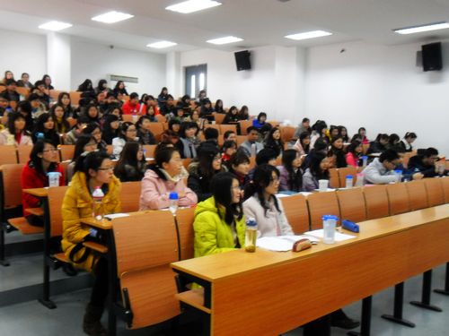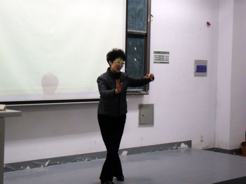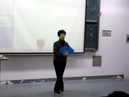 随后,在大家的掌声中,黄老师走上讲台。她说今天是个特别的日子,她鼓励到场的所有男同学一起喊出“三八妇女节快乐”,同学们的配合让黄老师很欣慰。首先,黄老师就形体、声音、装饰上教同学们如何区分四大名旦。