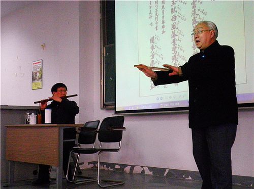 随后,在周秦老师悠扬的笛声的伴奏下,蔡老师为我们表演了穷生,惟妙惟肖,眼神、动作、唱腔完美结合。更过瘾的是,老师亮出了小生的招牌道具――扇子,并为我们演唱了一段《琴挑――懒画眉》。蔡老师在感冒的情况下,连唱两段,嗓音却仍然洪亮,大家的掌声久久不停。