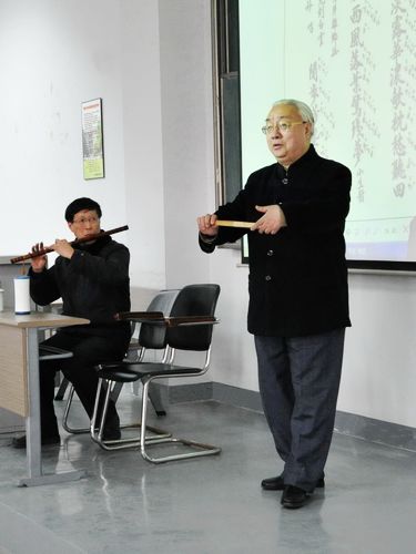 周秦老师用精心准备好的几张旧照片带学生们一点点走进了蔡老师的昆曲世界,蔡老师也由此饶有兴致地回忆了他和昆曲的一些不为人知的小故事。之后,他从穷生、巾生、雉尾生和冠生这几个方面详细介绍了昆曲小生行当的表演特色,现场示范的两段《琴挑・懒画眉》和《哭像・脱布衫》更将讲座气氛推向了高潮。