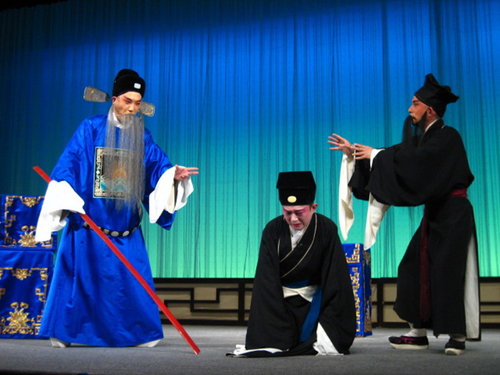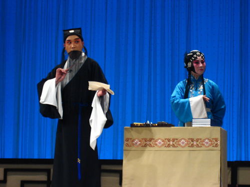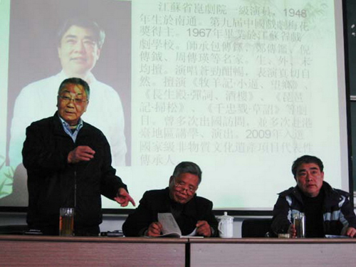 2011年3月30日下午2时,江苏省昆剧院著名昆剧表演艺术家姚继�老师、黄小午老师与复旦大学中文系江巨荣教授一起,为苏州大学的学子带来了一场题为《昆剧老生艺术及其传承》的讲座。这是苏州大学白先勇昆曲传承计划的第七单元活动。三位老师围绕着老生这一行当的特色、代表人物的塑造以及当晚专场要上演的三个剧目情况展开了精彩纷呈的对话。姚老师通过当晚要上演剧目中老生演员的三副髯口为大家讲解了老生行当里各种人物的不同之处,黄老师则主要从唱腔方面让同学们更全面地了解了昆曲老生的表演艺术。两位艺术家轮流示范,声情并茂。最后,江老师从学者的角度对昆剧老生艺术进行了准确精道的总结。