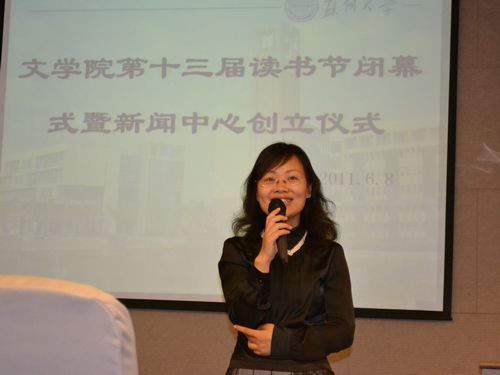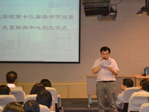 2011年6月8日下午,在苏州大学独墅湖校区文综楼5339报告厅隆重举行了文学院第十三届读书节闭幕式和文学院新闻中心成立仪式。校党委宣传部副部长孙宁华,校团委副书记程晓军,文学院党委书记王六一,文学院副书记、副院长张健,文学院团委书记纪金平,文学院学工办副主任、团委副书记胡萱等嘉宾应邀出席了此次活动。