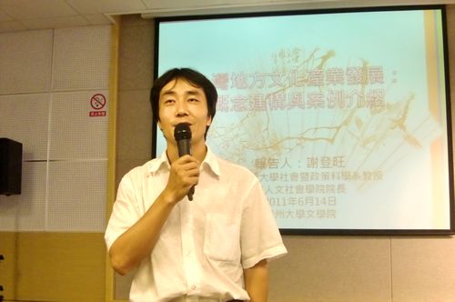 谢教授以一副暗藏“苏州大学”和他本人名字的打游对联开始了本次讲座。在说明文化是什么的基础上,谢教授提出了文化商品化的概念:是技术进步的基础上和全球化时代背景下进入市场机制和消费型态的经济与文化的一种复合。“而文化的味道可藉体验行销争取顾客认同”。文化产业是结合创作、生产与商业的内容,同时这些内容在本质上具有无形资产与文化概念的特性,并获得知识产权的保护,其形式可以是货品或是服务。从内容来看,文化产业也可以视为创意产业;或在经济领域中,称之为未来性产业,或在科技领域中,称之为内容产业。接着谢教授又对文化产业的特性、文化产业的意义及社区总体营造与“文化产业推动”间的关系进行了重点介绍。“一乡一物一特产,一村一品一艺文”则是台湾地区产业文化的具体内涵和实践目标。