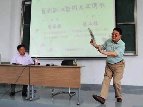 赵山林教授先简单介绍了刘异龙老师的艺术成就。接着,刘老师从自己的从艺经历讲起,结合多年的舞台经验,配合以生动的唱念做舞示范,详细介绍了丑行演员所需要具备的基本素质,讲解了“副”与“丑”之间的区别和联系,并表达了自己对于昆曲继承与发展的见解。刘老师早年曾学习过生、净、老旦等多个行当,从而为形成自己的艺术风格打下了坚实基础。在剧目传承上,不仅继承,更有发扬,为昆曲的延续做出了卓越的贡献。刘老师的坎坷经历和精彩示范赢得了在场师生的阵阵掌声与笑声。
