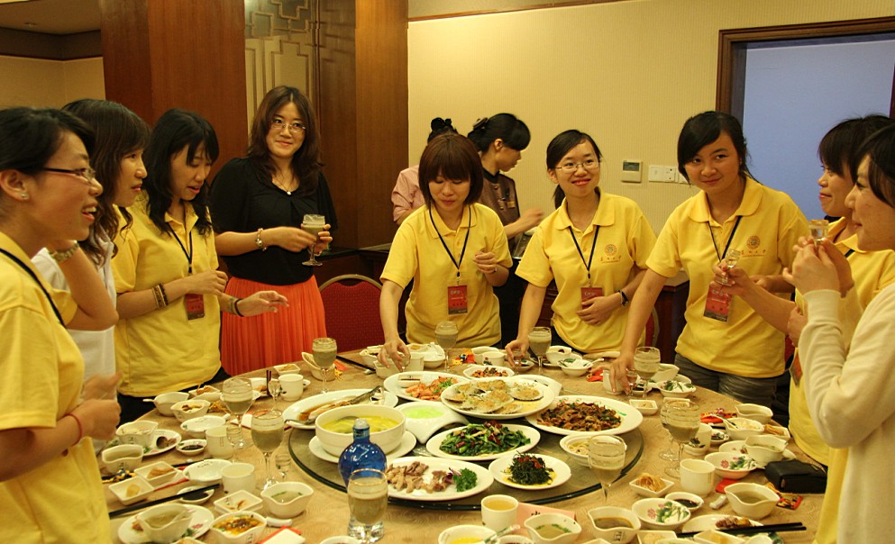 常来大陆走一走看一看。随后,省台办领导还拿出了“味占江南第一家”的洋河大曲为大家饯行,并风趣幽默地讲述了源远流长的中华酒文化,引起两岸学生的共鸣。台湾同学纷纷举起酒杯,对各位领导、师生一周以来的精心安排与悉心照顾表示由衷感谢,并盛情邀请大陆师生赴台游玩。廖伟汝、赖冠桦等女同学虽然初次饮酒,不胜杯酌,为表心意,也是一饮而尽,赢得大家鼓掌喝彩。苏州大学的师生希望文化交流营仿佛友谊的种子一般生根发芽,欢迎更多的朋友来江南观光学习。酒店的民间艺人还为大家表演了抖空竹、长笛独奏等节目,不断将宴会推向高潮。伴随着《茉莉花》悠扬的旋律,两岸同学,品佳肴,饮佳酿,赏佳曲,依依不舍话别情,其乐融融。