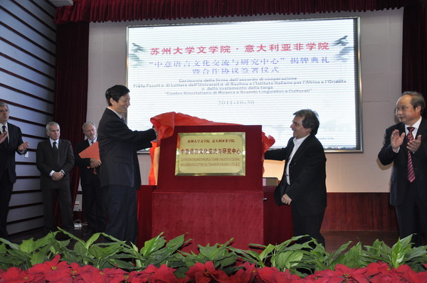 在台下观众热烈的掌声中,苏州大学朱秀林校长、意大利公共行政与创新部部长雷纳托・布鲁内塔为“中意语言文化交流与研究中心”揭牌。他们共同托起牌子,紧紧握住合作之手,用相机记下了这历史性的一刻。