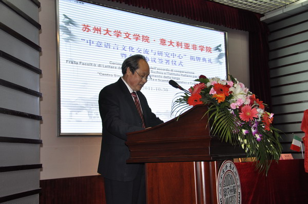 出席仪式的意方代表有意大利公共行政与创新部部长雷纳托・布鲁内塔(Renato Brunetta)先生、意大利驻华大使馆大使严农祺(Massimo Attilio Iannucci)先生、意大利驻沪总领事馆总领事德鲁卡(Vincenzo De Luca)先生、意大利亚非学院上海分院院长乔治・卡萨齐(Giorgio Casacchia)教授及相关部门负责人。中方代表有苏州市外办领导潘越先生,赵峥先生、苏州大学校长朱秀林教授、苏州大学副校长张学光教授、苏州大学文学院党委书记王六一、副院长黄镇伟、逢成华、副书记张健、院语言学专业主任王建军教授及苏州大学相关领导。