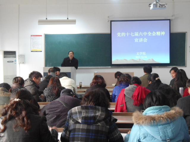 2011年12月14日下午两点,我院在1003―3305举行了党的十七届六中全会精神宣讲会。院长王尧、院党委书记王六一发表讲话,文学院全体在职教职工出席了本次宣讲会。
