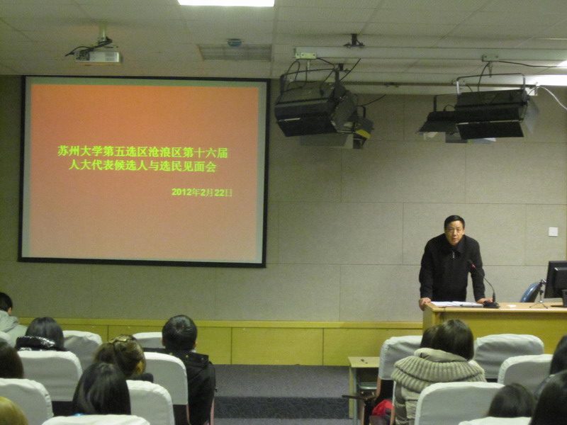 根据沧浪区选举委员会《关于召开代表候选人与选民见面会的规定》,经沧浪区选举委员会同意,苏州大学第五选区于2012年2月22日下午4点在独墅湖校区文综楼1005――5339召开了第五选区代表候选人与选民见面会。选区组长王六一,代表候选人吴雨平教授、黄辛隐教授,以及选区内各选民小组组长和部分选民代表参加了会议。