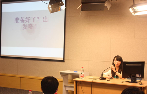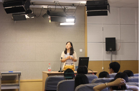 首先发言的是卞梦娜同学,她向大家详细地介绍了出国的相关准备工作,包括行李的准备和乘坐飞机的相关注意事项,并着重跟老师同学们分享了在波特兰市生活的细节,如购物、交通、住宿等。卞梦娜同学还向大家展示了在美国教学的照片,通过幻灯片,在场的同学们也生动地感受到了志愿者老师们和美国学生间深厚的情谊。